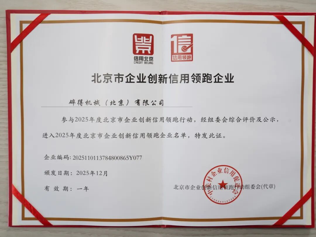 近日,碎得机械获评 2025 年北京市企业创新信用领跑企业。该评选基于企业在诚信经营、规范管理及履约能力等方面的综合表现,旨在树立区域信用建设标杆。